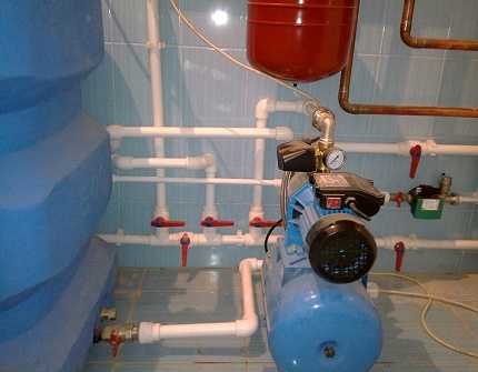 Насосные станции нередко используются в сложно-разветвленных и протяженных водопроводах в качестве повысительного оборудования, перекачивающего воду из накопительного бака в точкам водоразбора