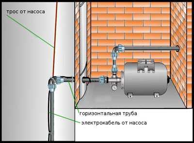 Насос опускается на тросе на нужную глубину. Гибкий шланг или гофротруба соединяет его с тройником.