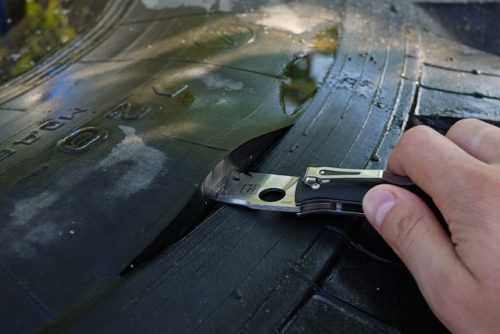 - В конце срежьте боковину покрышки при помощи острого ножа. Направляйте лезвие от себя. На боковине покрышки есть линия. Проще всего срезать по ней.