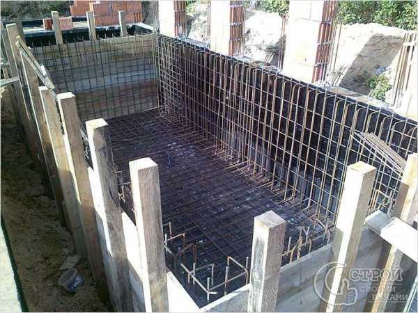 Перед тем как начинать работу со стенками, надо учесть необходимость монтажа системы слива воды.- Следующий этап работ — опалубка.