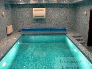 После того, как произвели облицовку, приступаем к монтажу основного оборудования. В дешевом варианте применяется навесной скиммер с возвратной форсункой. Фильтр и остальные агрегаты располагаются в этом помещении. Оборудование декорируют и закрывают в виде маленького деревянного шкафа. Это очень удобно, потому что не нужно искать дополнительное место в другой комнате. Чтобы избежать сильной влажности, поверхность воды накрывают плавающим покрывалом. Для удобства работы с покрывалом монтируют ролик. На стенку комнаты вешают осушитель воздуха, так как система вентиляции здесь не предусмотрена.