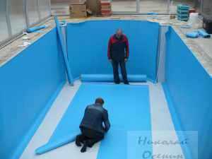 Теперь необходимо залить на дно бетонную смесь слоем в 100 миллиметров и дать ей 5–7 суток на то, чтобы она затвердела. После этого можно заняться гидроизоляцией бассейна. Для этого используют ПВХ-плёнку.