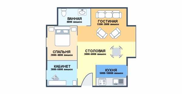 Существует формула света, благодаря которой получается нужная мощность освещенности: одному метру в кубе помещения должно соответствовать 20 W мощности. Умножьте объем квартиры на 20 и получится необходимая мощность ее освещенности.