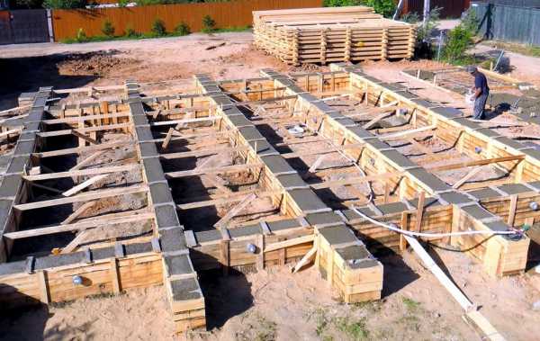 Сваи для такого фундамента лучше выбирать с расширенной пяткой, так увеличиваются их несущие характеристики. Бурить под них отверстия можно вручную буром или используя автоматику. Для опалубки берут рубероид, сложенный в несколько слоев, или трубы из ПВХ или асбестоцемента. Внутрь свай крепятся скрепленные между собой прутья арматуры, а потом все это заливается бетоном. После заливки сверху крепится ростверка (опалубка для ленты), в которую кладется связанная арматура, которая, в свою очередь, соединяется с концами арматуры из свай. Желательно сразу оставлять место для прокладки коммуникаций и вентиляции.