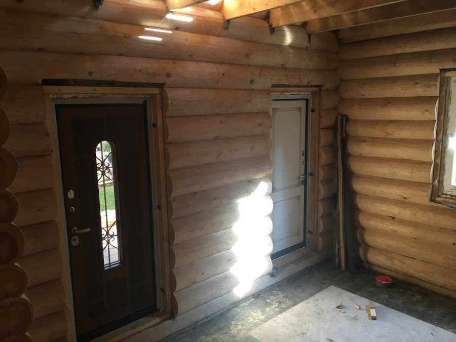 - Усадка построек из бревна и бруса. Этот процесс вызван естественным высыханием древесины. Он происходит достаточно длительное время, но особенно активно – в первый год после возведения сруба. В результате не рекомендуется использовать при установке входной двери жесткую фиксацию короба к конструкциям дома;