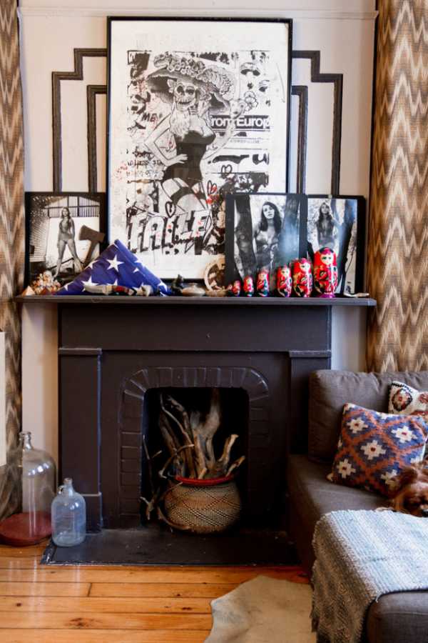 Как Вы уже убедились, оформление декоративного камина открывает массу возможностей для творчества. Еще один выход – разместить внутри каминного портала маленький «музей». Тут уж все ограничивается только Вашей фантазией и наличием интересных интерьерных элементов. В ход может пойти все, что хотите – от коллекции старинных будильников и статуэток, до картинок и поделок.
