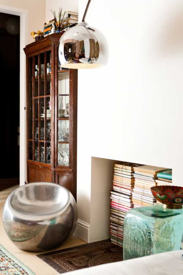 Книжная коллекция, размещенная не в шкафу, а в каминном проеме, смотрится оригинально