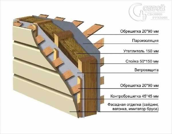 Схема пирога каркасной стеныВарианты обшивки могут быть разными. Это сайдинг, блок-хаус, вагонка и другое. Под обшивку внахлест укладывается прочный, водонепроницаемый материал, с запасом 20-30 см.