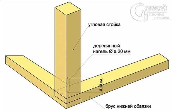 Особое внимание необходимо уделить углам. Здесь выполняется обязательное укрепление стоек укосинами.