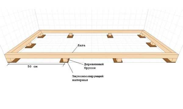 Прежде всего, необходимо сделать гидроизоляцию дома. На фундамент нужно положить несколько слоев рубероида. Затем между собой они соединяются с помощью битумной мастики, и производиться укладка лаг. В качестве лаг используется брус, который следует уложить на цоколь фундамента концами. Таким образом, середина бруса должна находиться на опорах фундамента, которые расположены внутри периметра дома. При этом важно чтобы поверхность бруса, которая находиться внутри помещения и на которую будет впоследствии монтироваться покрытие пола, была абсолютно ровной. Поэтому, перед выполнением укладки, чтобы выровнять дерево его необходимо обработать с помощью бензопилы. В процессе работы чтобы вся конструкция была ровной, следует постоянно использовать уровень. В том случае, если брус не совпадает с необходимым уровнем, его можно слегка поднять с помощью подкладывания под него цельной доски.