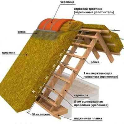 После монтажа обрешетки в нее необходимо уложить утеплитель. Наиболее распространенным материалом ввиду своих высоких эксплуатационных характеристик является минеральная вата. Она укладывается в пространство обрешетки. Затем выполняется пароизоляция и гидроизоляция, которые необходимы для защиты теплоизоляционного материала от влажности и конденсата, а также для того, чтобы защитить кровлю от проникновения холодного воздуха.