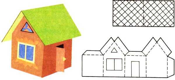 Конструируя домик, маленький или объемный, простой или сложный, сначала создают эскиз. Работу начинают с чертежа. При наличии только небольших листов для изготовления домика побольше можно разрезать чертёж по пунктиру и выполнять каждую часть отдельно.