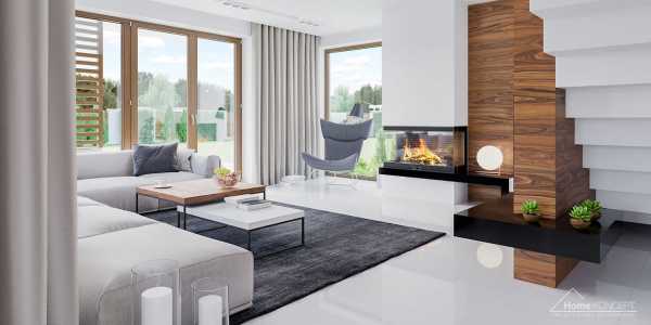 Дизайн интерьера гостиной с камином и панорамным остеклением