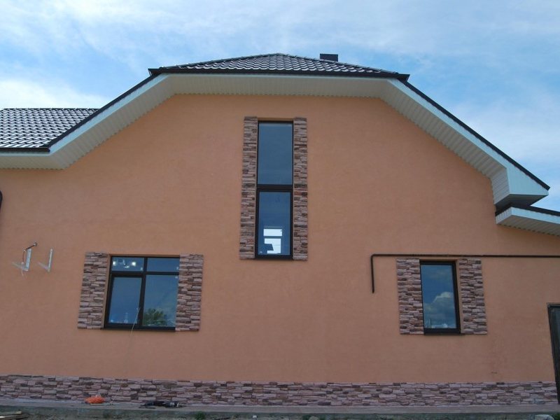 Этот вид наружной отделки смотрится очень привлекательно. Это могут быть вставки из дерева, фигурные элементы — даже просто оштукатуренные стены с известным узором «короед» тоже смотрятся красиво! Сравнительно невысокая цена, возможность перекрасить цвет, но при этом — длительность монтажа, необходимость четко соблюдать время высыхания слоев и температурного режима. Также требует высокой квалификации отделочников.