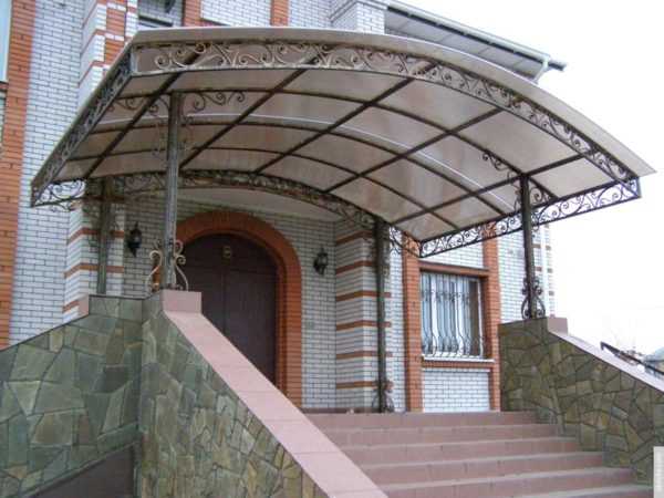 В современном исполнении листовой металл скатов козырька и навесов с успехом заменили рифленым поликарбонатом. Дорогой кованый декор уступил наборному рисунку, собранному из частей электросваркой.