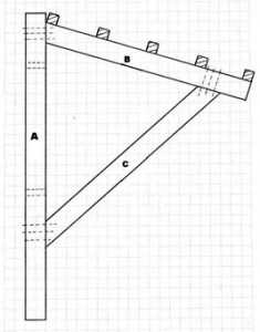 - С помощью продольных балок и распорок из готовых стропил собирают двускатный каркас. Его соединяют с двумя дополнительными вертикальными опорами, усиленными укосинами.