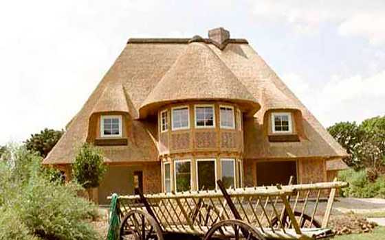 Мансардная крыша частного дома, выполненная из натурального сырья — это очень красиво! Отлично способен подчеркнуть яркие цветовые оттенки стен загородного дома камыш, использованный в качестве кровельного покрытия, при этом такое покрытие замечательно впишется в ландшафтный дизайн лесного массива. Благоприятную атмосферу природности идеально дополнят сад, газоны на приусадебной территории.