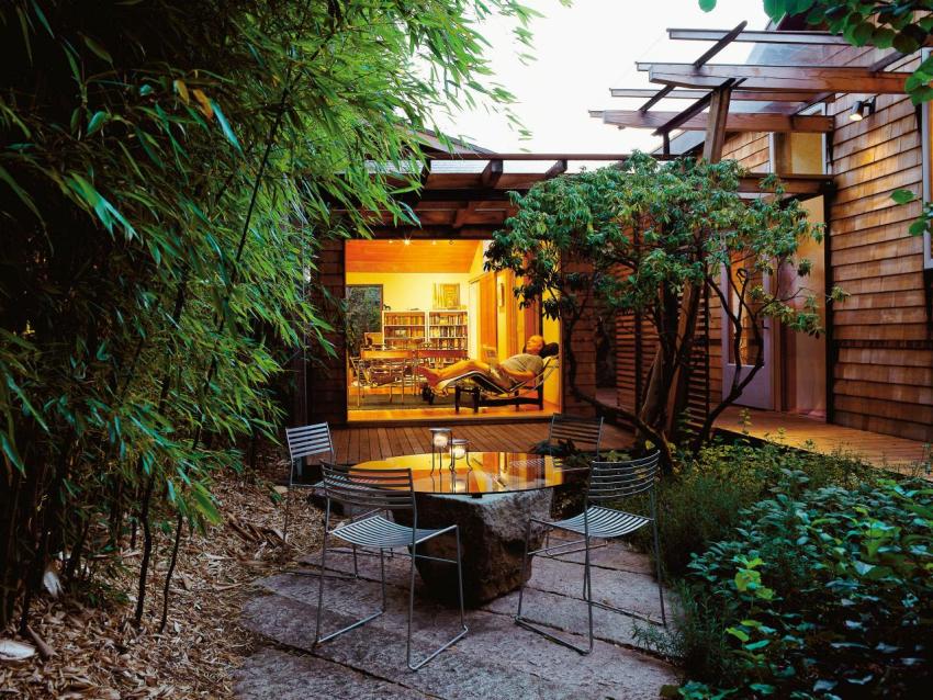 В качестве материала можно использовать бамбуковые циновки, лозу и речные щиты. Такие ширмы представляют не только декоративный вид, но и помогут зонировать пространство, создадут тень и защитят от ветра. В одном из дальних углов двора за кустами и цветами можно расположить небольшой сарай или шалаш, который станет дополняющие ландшафтный дизайн элементом, а также местом для детей, где они смогут поиграть.
