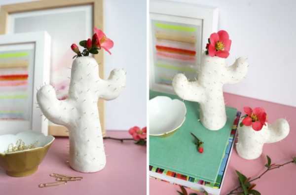 Чтобы сделать такую креативную вазу, будет нужен скульптурный пластилин. Из нее легко слепить форму кактус ас отверстием для цветка внутри. Колючки можно сделать из проволоки для бижутерии. При желании можно легко дополнить такую поделку или слепить ее другого размера.