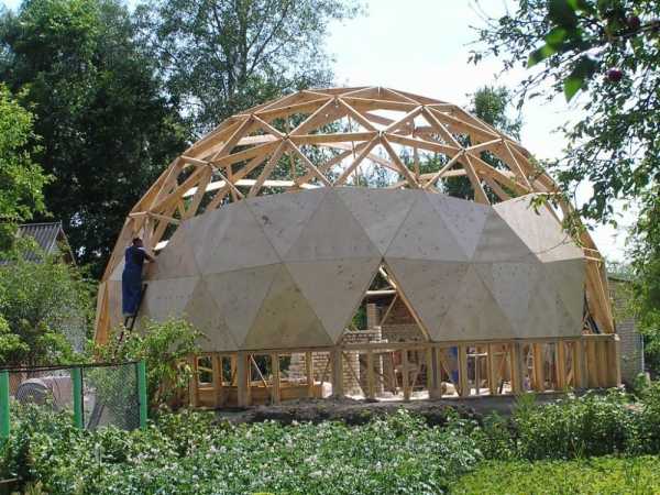 - Изготовление проекта круглого дома, в котором сфера или полусфера будет разбита на фрагменты или треугольники. Так будет проще рассчитывать нагрузку, и тем более, что конструкцию из треугольников намного проще обшить.