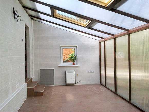 Обратите внимание: по этим инструкциям можно построить также крыльцо из поликарбоната и дерева. Вам будет нужно только заменить металлические профили в каркасе на брус из дерева (5х5 см). Собираться вся постройка будет в этом случае на саморезы.Внутреннее оформление крыльца из поликарбоната