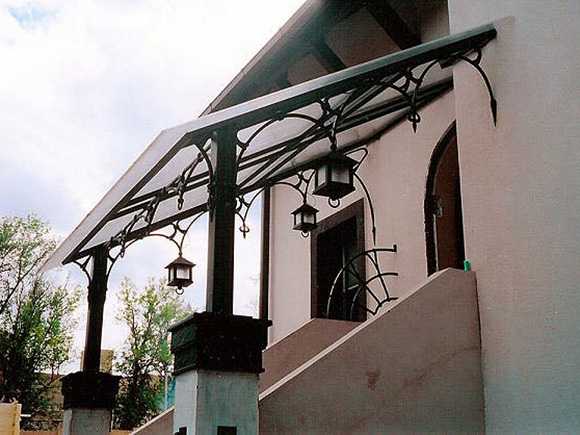 Особенность этого материала в том, что даже тяжелый металлический навес, изобилующий массивными конструктивными элементами и замысловатой фигурной ковкой, он делает визуально менее громоздким.