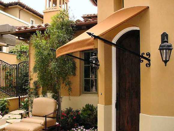 Активно, в последнее время, для устройства навесов над входом в дом стали использовать современные рулонные покрытия, которые представлены на рынке в широкой цветовой гамме и могут легко вписаться в любую архитектуру.
