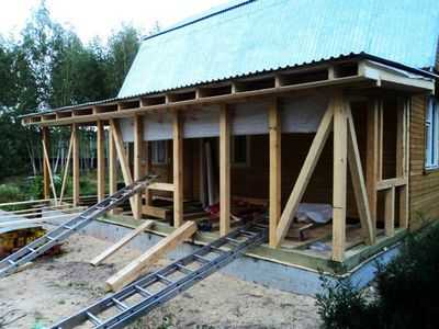- Крышу рекомендуется делать односкатной. Для этого стойки, примыкающие к стене дома, вырезают выше, чем передние. Делается обвязка из брусьев, и крепятся стропила под крышу. Для гидроизоляции используется гидроизол или рубероид. Сверху крышу покрывают шифером или другим кровельным материалом. Утепление крыши изнутри проводят пенополиуретановыми матами.