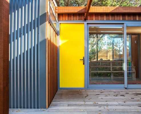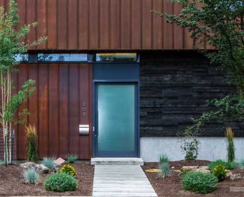 Насыщенный яркий цвет входной двери преображает спокойную отделку фасада здания. Небольшая стеклянная вставка возле двери позволит жильцам видеть посетителя изнутри помещения.