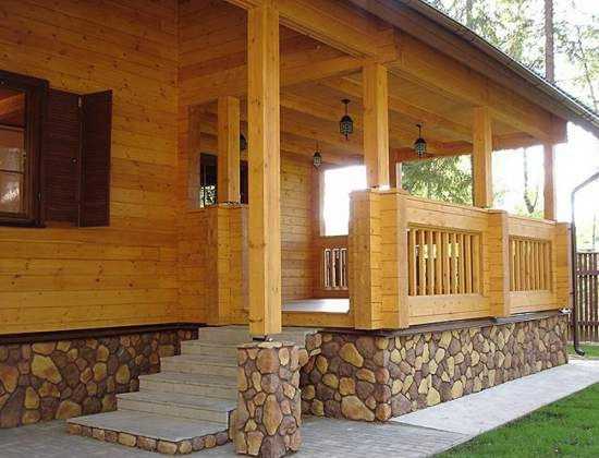 Красивые крылечки деревянных домов. Фото постройки из бруса, с основанием, облицованным искусственным камнем