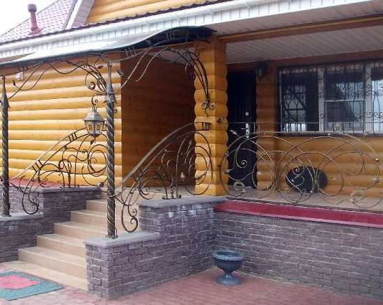 Красивое крыльцо для деревянного дома с коваными ограждениями способно органично вписаться в архитектуру строения. Обойтись оно может на много дороже, однако внешний вид вашего рубленого дома будет на высоте. Кроме того, металлическое кружево визуально облегчит массивную деревянную конструкцию. Возводить кованые крылечки можно как на одном фундаменте с основной постройкой, так и на отдельном.