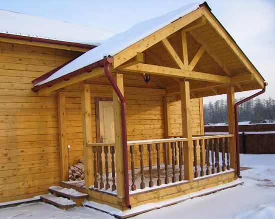 И еще один вариант, который подойдет для деревянного или каркасного дома. Ограждение здесь возводится только на площадке, крыша опирается на четыре передних столба, а задней частью крепится на стену самого дома. Столбы и ограждение может быть сделано как из дерева, так и из полиуретана. Основание – монолитное или свайное, отдельное от основной постройки.