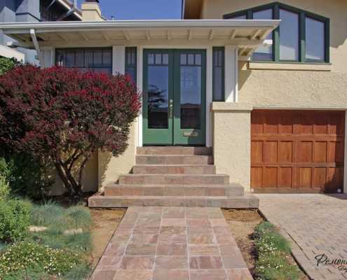 В том случае, если дом несколько возвышается над участком, дорожки к крыльцу лучше выполнить в форме ступенек, что значительно облегчит спуск и подъем к дому: