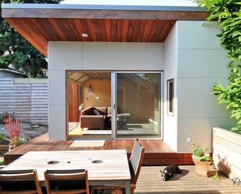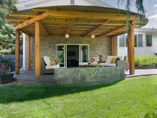 Небольшой участок земли перед домом можно использовать для продолжения крыльца. Веранда не только защитит крыльцо от осадков, но и послужит местом отдыха на свежем воздухе. Лучший вариант для обустройства веранды – раздвижные стеклянные двери, которые спрячут от ветра или дождя: