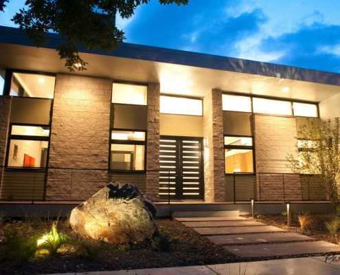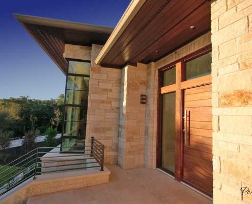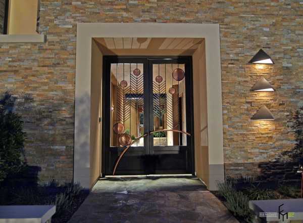 Двери необычного дизайна со стеклянными вставками и медными элементами способны стать визитной карточкой современного здания. На фоне каменной облицовки выигрышно смотрятся оригинальные настенные фонари для улицы в форме пирамид.