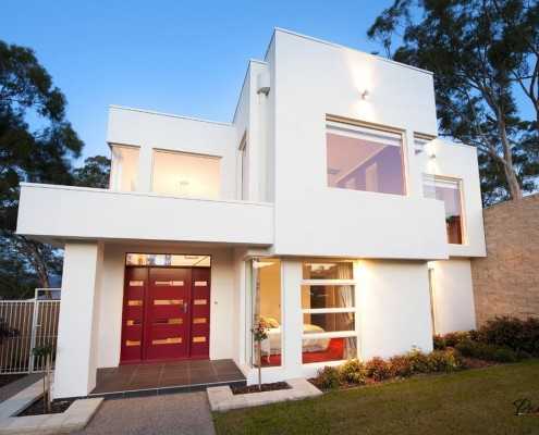 Выложенная из светлого камня дорожка к крыльцу с небольшими ступенями, усыпанное галькой пространство вокруг нее, кадки с растениями – все это помогло создать невероятно симметричный, сбалансированный внешний вид главного входа частного дома. На фоне белоснежной отделки гармонично смотрится большая двустворчатая деревянная дверь и темные конструкции решеток для окон и уличных светильников.