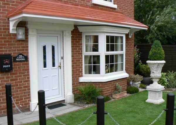 Даже небольшой козырек над входной дверью может облагородить главный вход частного дома. Тени от такой конструкции немного, от ветра она также не защитит, но спасет от дождя, пока вы открываете дверь или ждете такси.