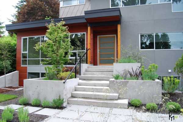 Бетонные плиты в качестве основы для организации подхода к главной двери дома, небольшие искусственные водоемы, растения в почве и больших садовых кадках – все работает на создание гармоничной атмосферы ландшафтного дизайна участка перед крыльцом.