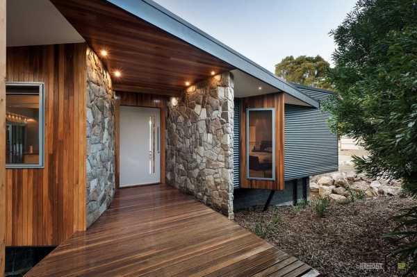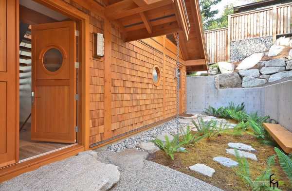 Облицовка частного дома с имитацией под древесину с использованием в экстерьере круглых отверстий, которые выполнены в виде иллюминаторов, стало интересной дизайнерской находкой. Оформление подхода к крыльцу с помощью камней различной формы и размеров дополнило нетривиальный внешний вид домовладения.