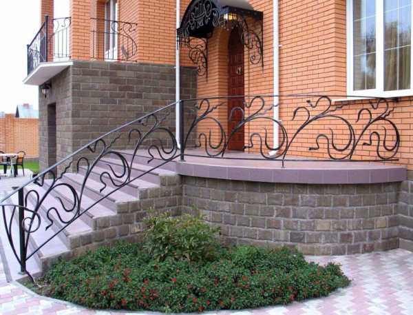 Также отлично смотрятся с каменными – или облицованными камнем – постройками кованые крылечки. Тут может быть два варианта: кованые ограждения на бетонном основании, облицованном плиткой или камнем; визуально невесомые, прозрачные металлические конструкции, как на следующем фото.