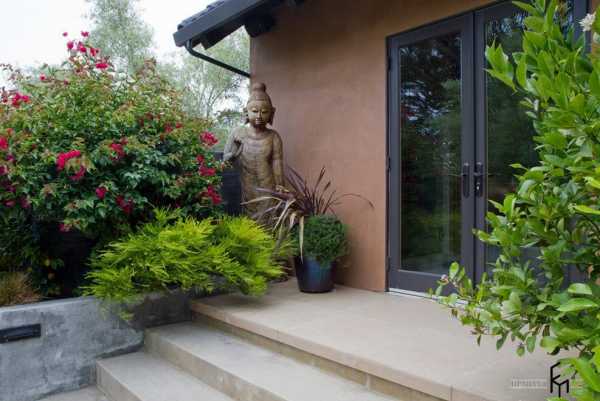 Еще одно крыльцо в восточном стиле с обилием вечнозеленых и цветущих растений, строгой отделкой и применением скульптур для организации садового ландшафта.