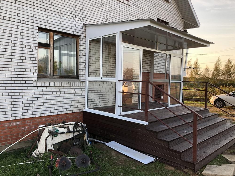- Закрытая. Для создания такой конструкции мастера чаще всего используют стекло или поликарбонат, в некоторых случаях таким материалом может выступать и москитная сетка. В этом случае обязательно должна быть большая площадка, поэтому закрытая конструкция может служить еще и альтернативой прихожей, где будет удобно провести время даже в непогоду.