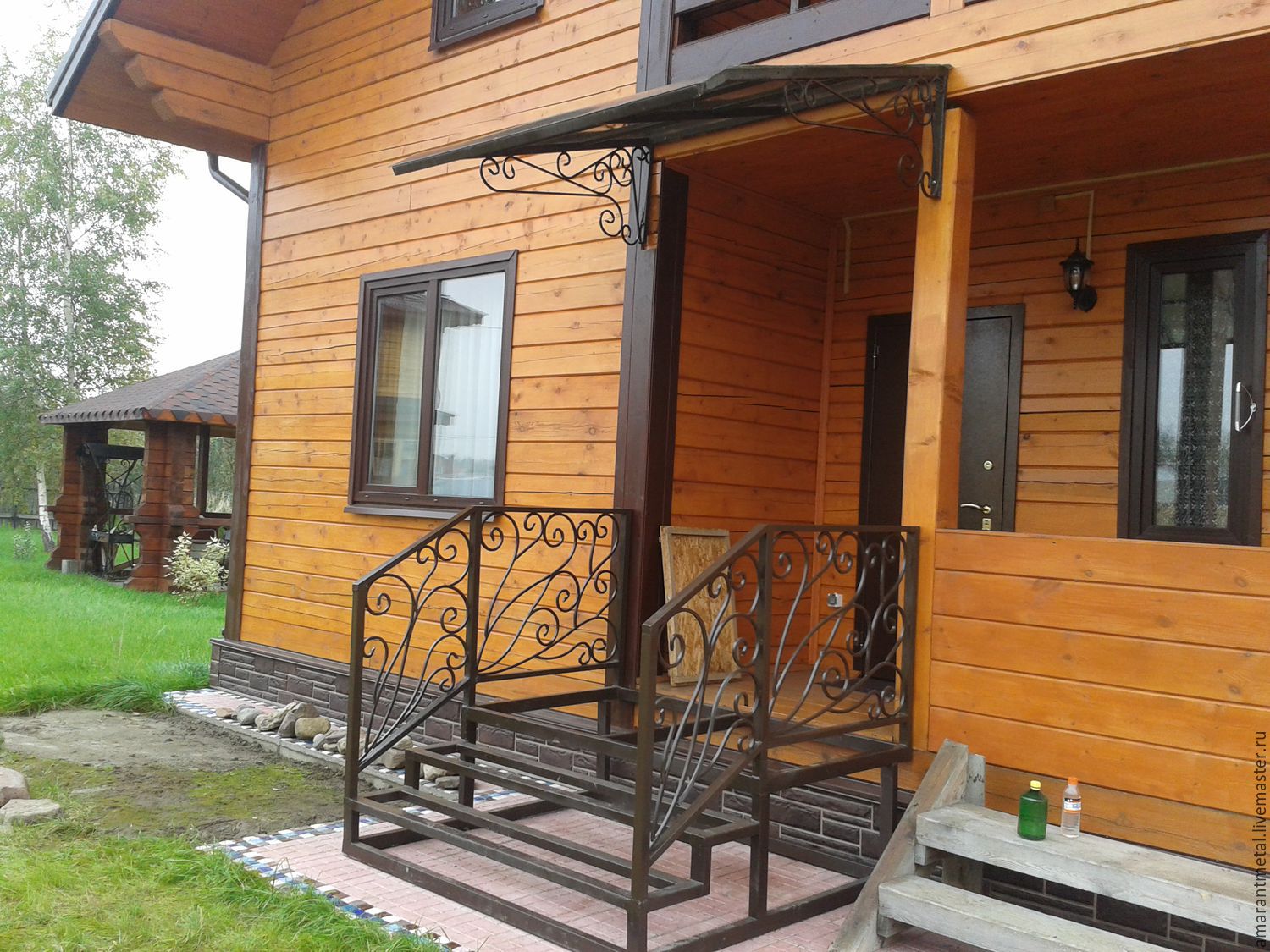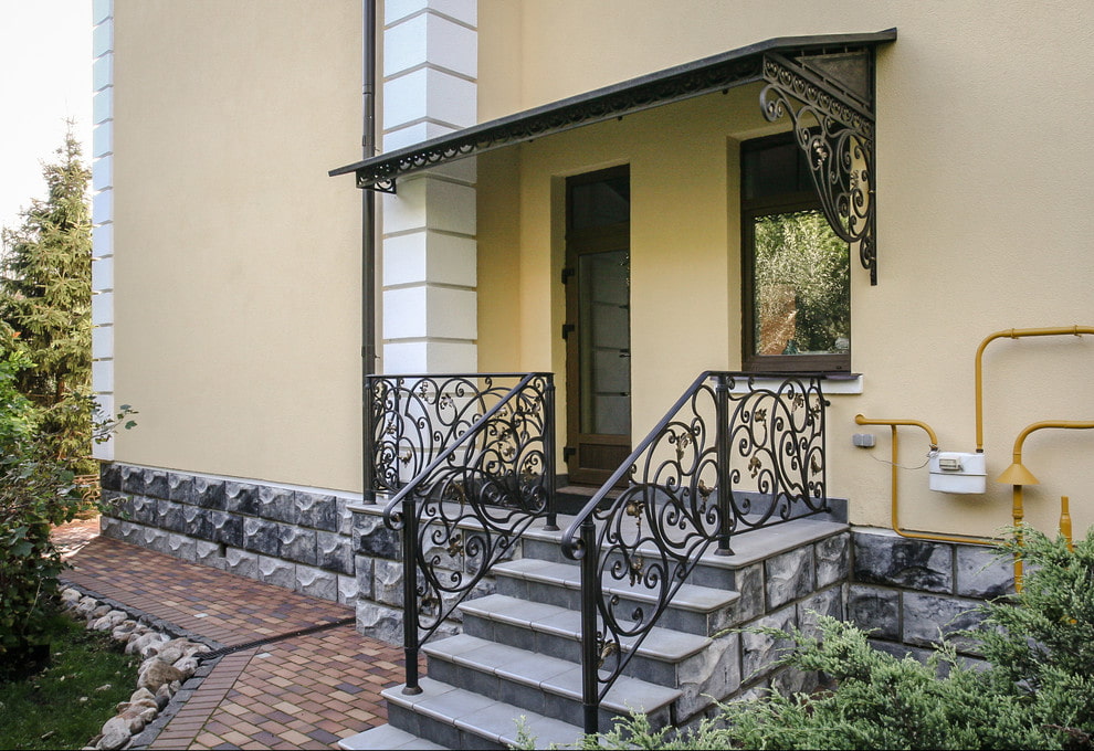 Наведем пример: дом с двускатной крышей требует аналогичного навеса крыльца, если же на окнах установлены решетки, перила должны иметь схожий кованый узор.