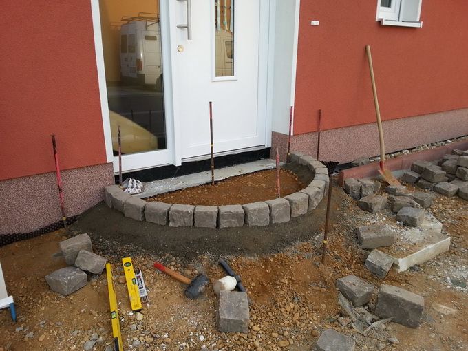 Если расчеты для строительства полукруглого крыльца верны, то оставшегося пространства до порога дома должно хватить для устройства 3 ступеньки. Вначале укладывают кирпич параллельными рядами у входа в дом. Примерно 6 рядов. При этом швы предыдущего ряда должны быть в середине последующего. В оставшееся пространство укладывают кирпичи, соблюдая угол укладки в 90° между ними. Залить слоем бетона. Уплотнить. Зачистить швы.