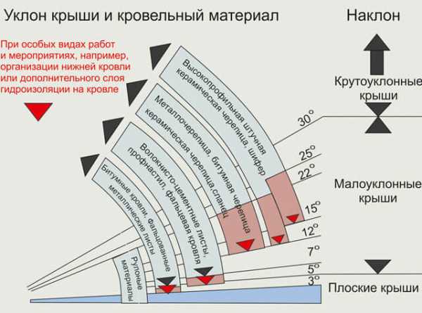 - Типа кровельного покрытия. Каждая разновидность конструкционного материала кровли накладывает ограничение на минимальное и максимальное значение вычисляемого угла.