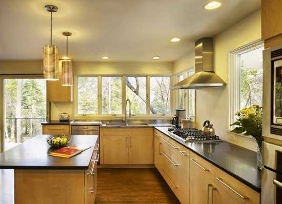 П-образное размещение мебели и бытовой техники подойдет только в том случае, если ширина кухни составляет, минимум, 3 метра. Самый распространенный вид у хозяек, когда мойка находится рядом с окном. Чтобы можно было мыть посуду и смотреть в окна на кухне своего частного дома. Это мечта любой хозяйки. Если вы тоже мечтаете о такой кухне, помните, что очень важно иметь широкий подоконник, чтобы брызги грязной воды не попадали на стекло. Кроме этого, вам потребуется установка специального смесителя. Он нужен для того, чтобы вы смогли открывать окно, когда это нужно.