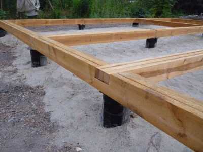 Нижняя обвязка каркасного дома на столбчатом фундаменте выполняется таким же образом.