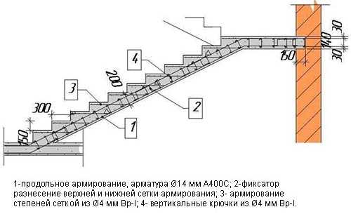 Как только закончена опалубка, делается армирующий каркас. Пруты не сваривают между собой, а обвязывают проволокой. Причем для монолитной конструкции начинают именно снизу, с продвижением кверху. Нижний слой идет по размеру основания, следующий – короче первого на ширину ступени и так до самого верха. На площадке между этажами арматуру укладывают в виде решетки.
