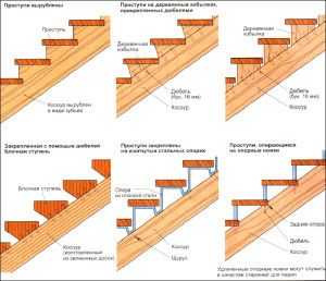В косоурах тоже делаются запилы для соединения с балкой, но в силу их различной конфигурации, выглядит это по-разному. Посмотрев на представленную выше схему, вы лучше поймёте, в чём состоят отличия. На ней так же показаны варианты крепления ступеней к косоуру.