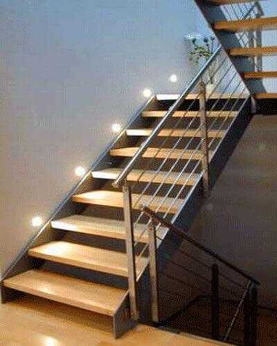 Правильное освещение лестницы — необходимое условие, для безопасного проживания в доме. При возможности продумйте варианты естественного освещения, запроектировав окно, и конечно освещение в темное время суток. Отлично смотрятся подсветка ступеней: чуть выше уровня проступи вдоль стены или в подступенках.